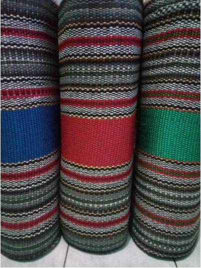 Tikar tenun gulung dengan tentengan sehingga dapat dibawa ke mana-mana yang berbahan benang dan tali rafia dengan berbagai pilihan warna merah, biru & Hijau. ukuran 3 x 1,8 meter.